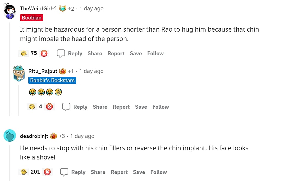 One user wrote, "It might be hazardous for a person shorter than Rao to hug him because that chin might impale the head of the person."