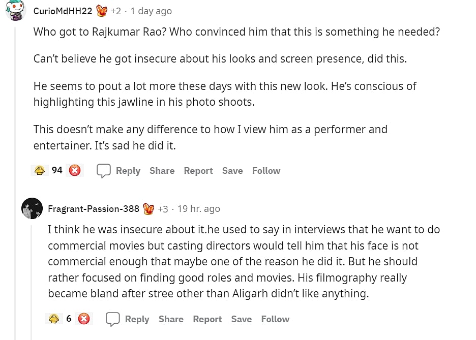 "Who got to Rajkumar Rao? Who convinced him that this was something he needed? Can’t believe he got insecure about his looks and screen presence, did this. He seems to pout a lot more these days with this new look. He’s conscious of highlighting this jawline in his photo shoots. This doesn’t make any difference to how I view him as a performer and entertainer. It’s sad he did it," wrote one user.