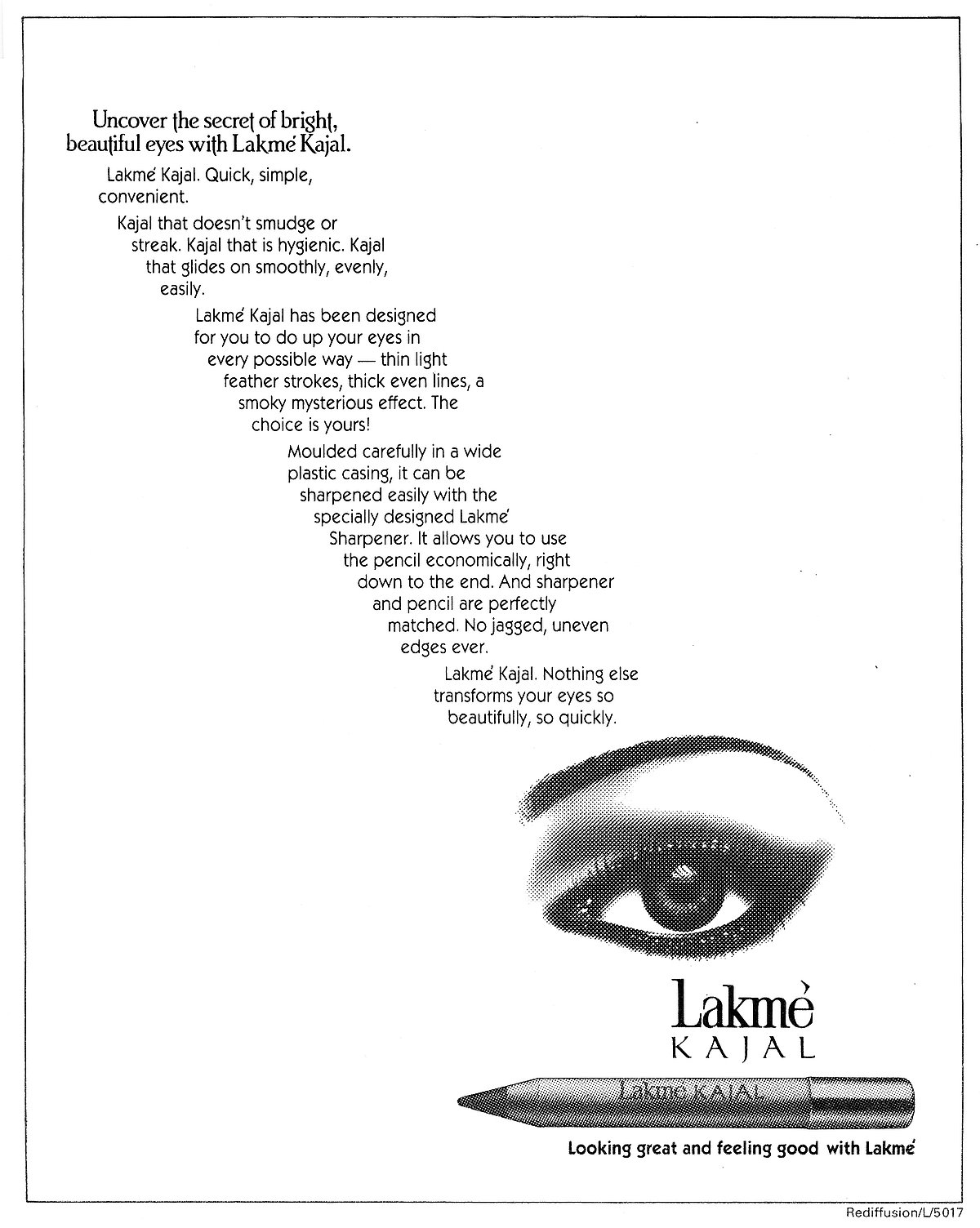 Shyamoli Varma, the Lakmé model, meanwhile had become a national celebrity because of the stunning creatives. But it was the Lakmé kajal film that took her to dizzy heights. Kajal had been traditionally made in India by trapping the smoke from burning ‘sarson’ oil. But in recent years, villains in Hindi movies were portrayed with heavy kajal make-up and the product had started to take on negative overtones. Shyamoli helped Rediffusion ‘uncover the secret of bright, beautiful eyes’ for Lakmé with kajal in pencil form.