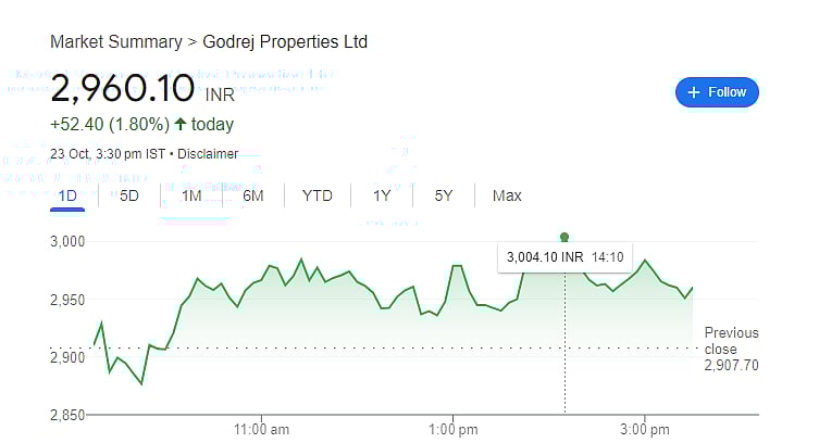 The shares of the Godrej Company went on to touch the day high level of Rs 3,012.95 per share on the NSE after hitting the opening bell at Rs 2,906.70 per share.