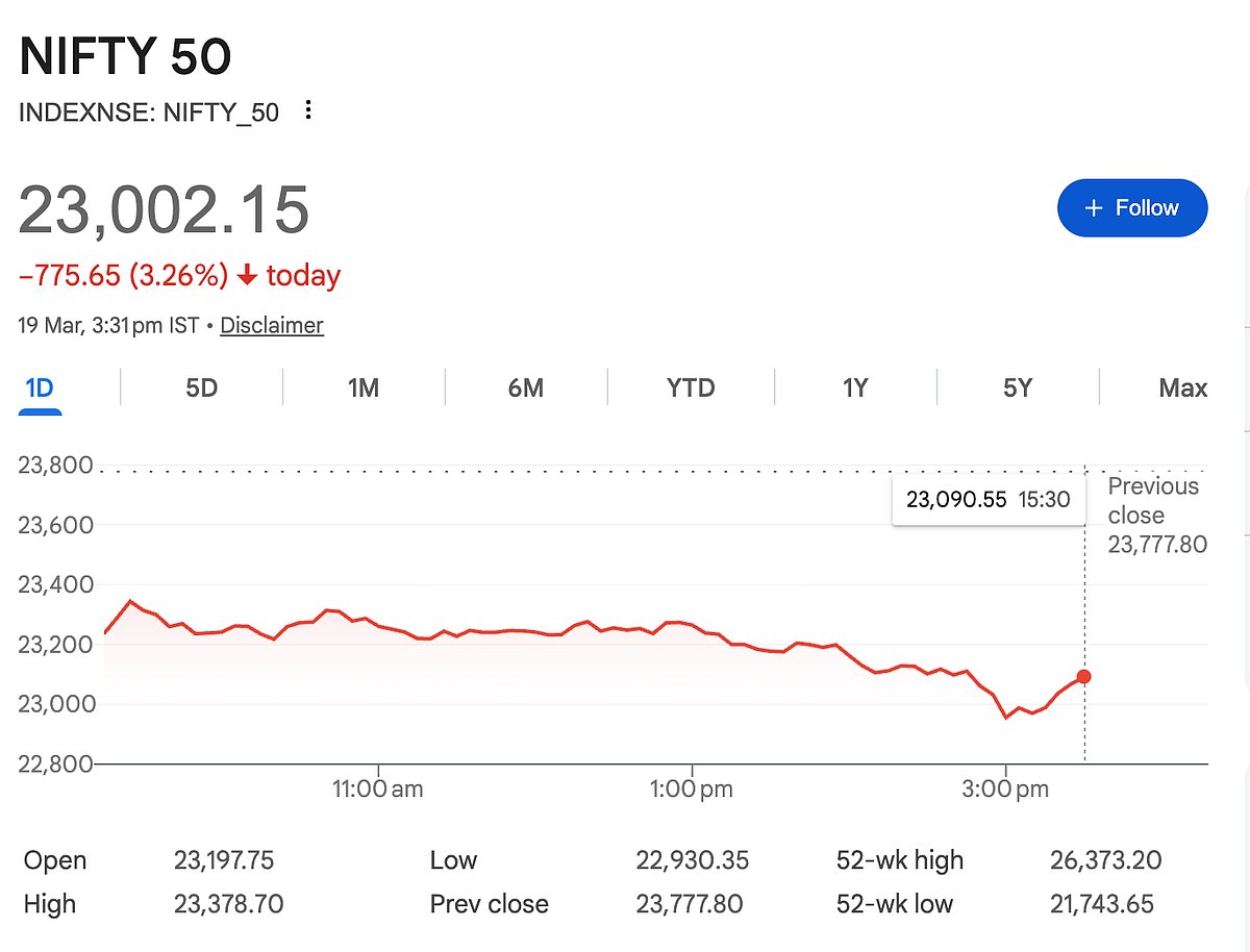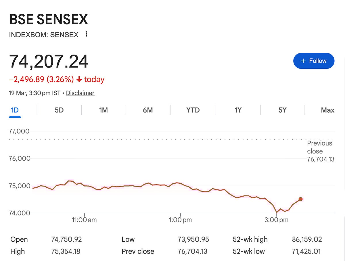 Mumbai: Indian stock markets saw a massive fall after three days of gains. The BSE Sensex dropped 2,496 points, or 3.26%, to close at 74,207. The NSE Nifty fell 775 points to end at 23,002. During the day, markets fell even more sharply.