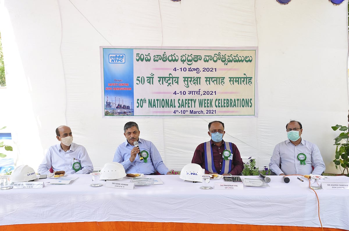 The 50th National Safety Week celebrations began at NTPC-Ramagundam on March 4, 2021. On the opening day, Safety Campaign was carried out at Gate No-I of the main plant with display of safety slogan placard by NTPC senior officials and others. Later at a program held at Safety Centre of the plant, Sunil Kumar, CGM (Ramagundam & Telangana) hoisted the National Safety Flag and underlined the importance of “Safety First”. He also declared the opening of safety week celebrations from March 04 to 10, 2021. While Sunil Kumar administered the Safety Pledge in English; A K Samaiyar, GM (O&M) and Ch Murali Krishna, GM (Mech Erection) administered in Hindi and Telugu respectively.