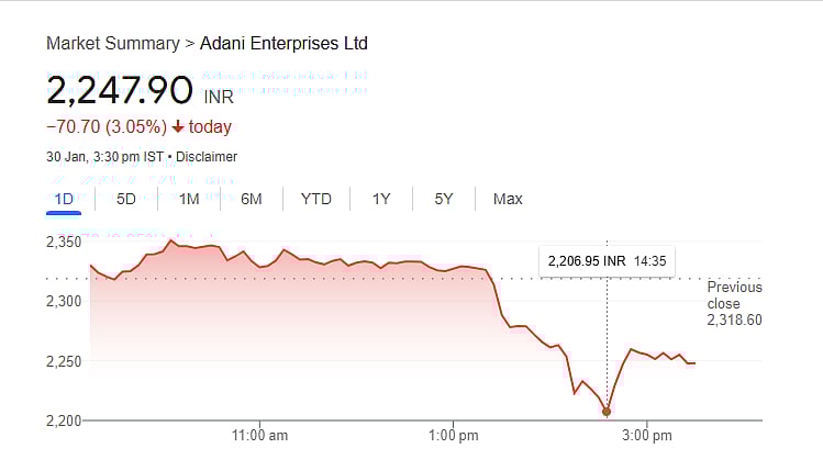 On the NSE, shares of Adani Enterprises are down 2.5 per cent at Rs 2,260.60 each. The market value of the company is Rs 2,58,859.65 crore.
