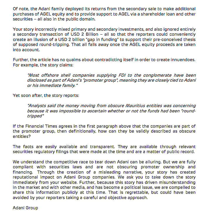 The company in the end said, "We understand the competitive race to tear down Adani can be alluring. But we are fully compliant with securities laws and are not obscuring promoter ownership and financing. Through the creation of a misleading narrative, your story has created a reputational impact on Adani Group companies. We ask you to take down the story immediately from your website. Further, because this story has driven misunderstanding in the market and with other media, and has become a political issue, we are compelled to share this information publicly at this time. That is regrettable, but could have been avoided by your reporters taking a careful and objective approach."