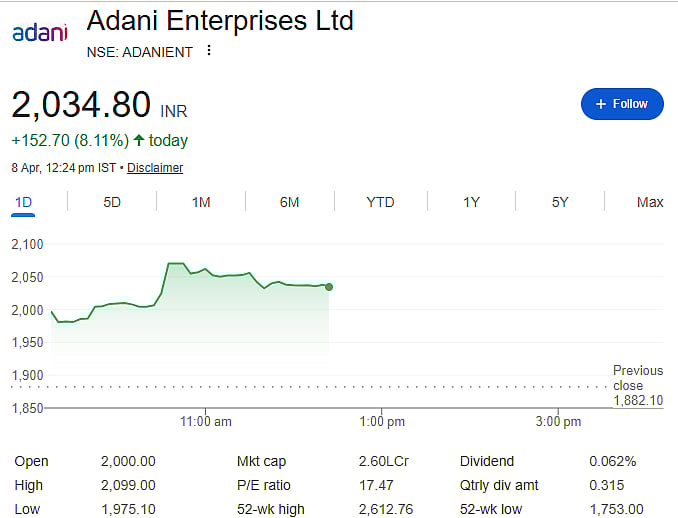 Adani Energy Solutions and Adani Enterprises rose up to 10 percent, while Adani Green Energy also jumped 10 percent. Adani Ports & SEZ gained over 8 percent, and Ambuja Cement and Adani Total Gas climbed around 9 percent. ACC rose about 7.5 percent, while Adani Power added nearly 6 percent.