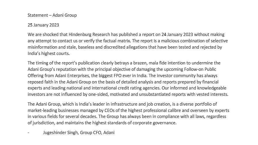 "The timing of the report’s publication clearly betrays a brazen, mala fide intention to undermine the Adani Group’s reputation with the principal objective of damaging the upcoming Follow-on Public Offering from Adani Enterprises, the biggest FPO ever in India."