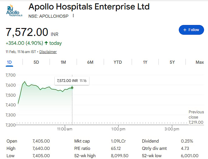 New Delhi: Apollo Hospitals shares rose sharply on February 11 after the company announced strong December quarter results. The stock climbed nearly 6 percent during the day and touched around Rs 7,640 on the NSE.