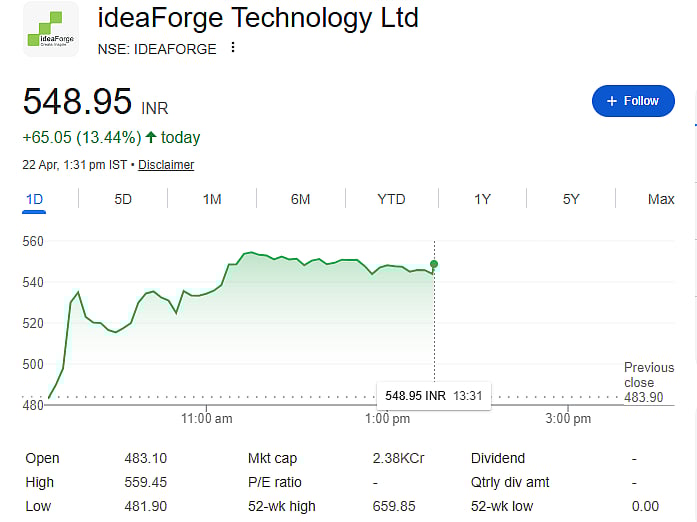 ideaForge Technology shares surged over 13 percent during the day. The stock moved up to Rs 548.95 from its previous close of Rs 483.90.