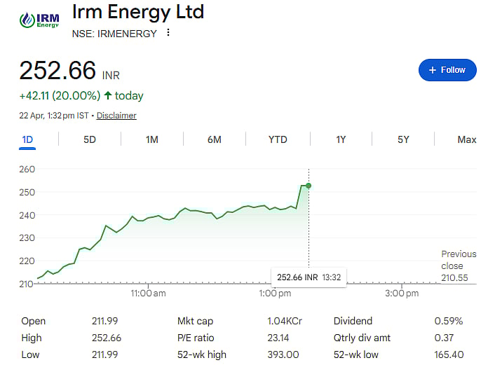 IRM Energy delivered one of the strongest moves. The stock hit a 20 percent upper circuit and reached Rs 252.66.