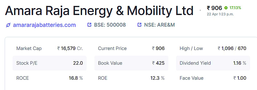 Amara Raja Energy & Mobility also saw strong gains, rising over 17 percent to Rs 906.