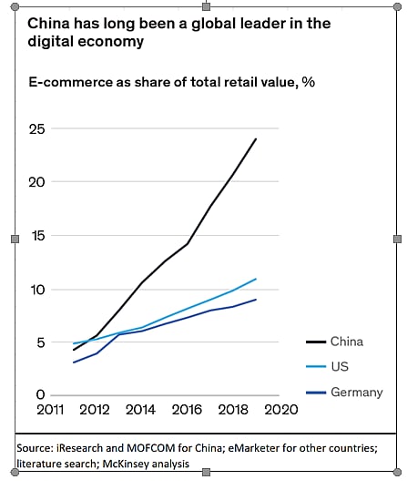 Mobile payment penetration is triple that of the US e-commerce accounted for 24 percent of total retail sales in 2019, compared with 9 percent in Germany, and 11 percent in the US.