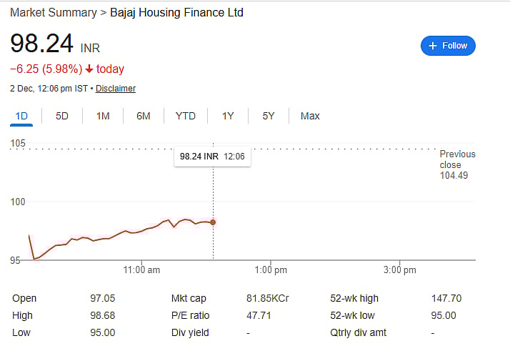 Mumbai: Shares of Bajaj Housing Finance saw a sudden and sharp fall in early trade on December 2, sliding nearly 9 percent to Rs 95. The drop came after reports that 19.5 crore shares, or 2.35 percent equity, had changed hands at Rs 97 per share through a block deal worth around Rs 1,890 crore.