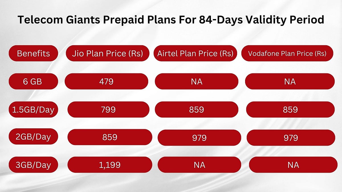 Comparing the 84-day validity prepaid plans, the focus is on data allowances ranging from 6GB to 3GB per day.