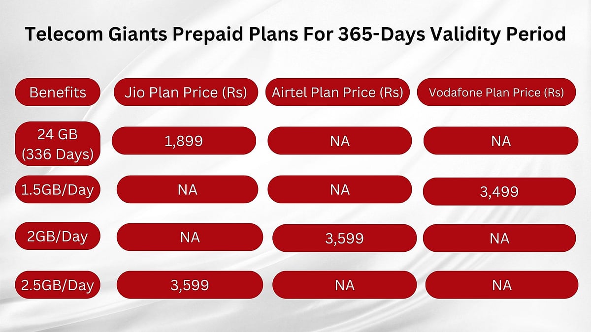 For the 365-day prepaid plans offered the three telecom providers, the diversity in their offerings is quite apparent.