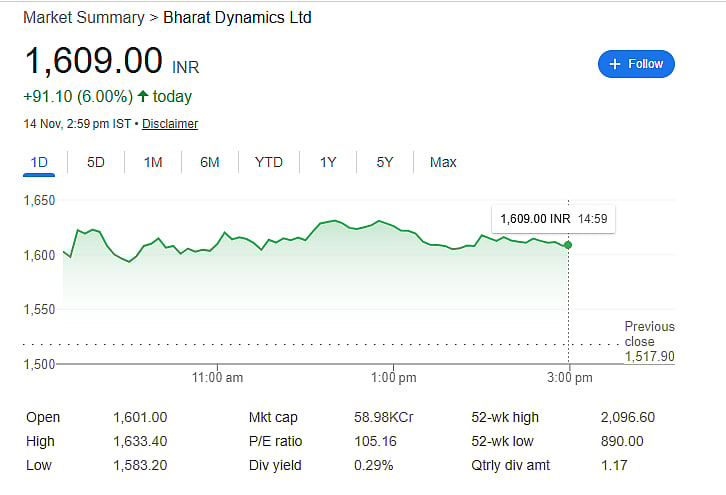 Mumbai: Amid a falling stock market, Bharat Dynamics Limited (BDL) saw its share price jump 7.2 percent to an intraday high of Rs 1,628.60. The rise came after the company announced robust second-quarter results and a major defence order from the Government of India. The Ministry of Defence awarded BDL a Rs 2,095.70 crore contract for supplying ‘Invar Anti-Tank Missiles’ to the Indian Army.