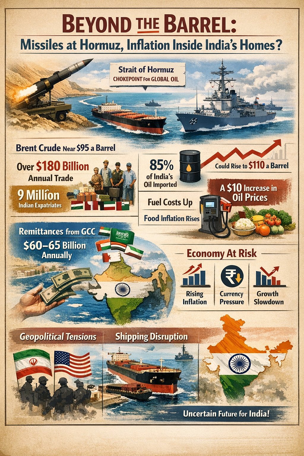 This war’s most dangerous theatre may not be the desert or the sea, but the invoice. If Hormuz tightens, inflation loosens. If tankers slow, remittances tremble. And in that ledger of risk, India emerges not as a combatant but as the most exposed spectator—a nation whose prosperity floats, quite literally, on a narrow strait patrolled by rival flags.