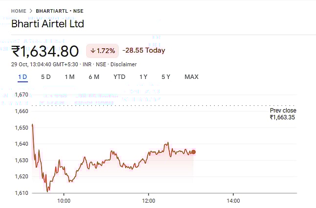 By 12:30 pm IST, the shares were trading at Rs 1,632.25, marking a decline of 1.87 per cent from Monday’s close. This ongoing slump has brought Bharti Airtel’s market cap to approximately Rs 9.78 lakh crore.