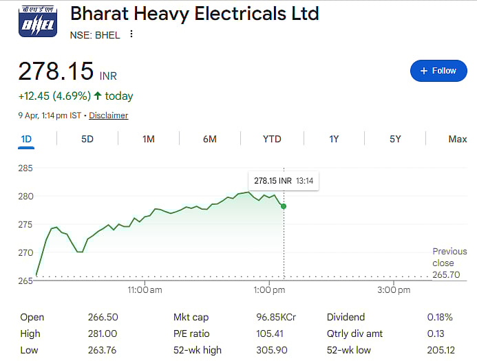 Mumbai: Shares of Bharat Heavy Electricals Ltd. (BHEL) jumped more than 5 percent on Thursday, April 9, reaching around Rs 280.60.