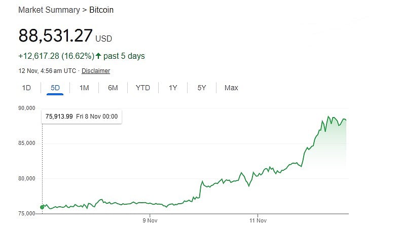 The most valuable cryptocurrency in the world increased by more than 25 per cent since November 5 and reached USD 89,637 in Asia, making it one of the most noticeable movements in the week following the election.