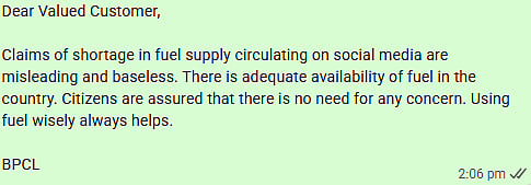 In a message sent to customers, BPCL said there is adequate availability of fuel across the country and citizens should not worry about supply disruptions. The company also advised people to use fuel responsibly and avoid unnecessary panic.