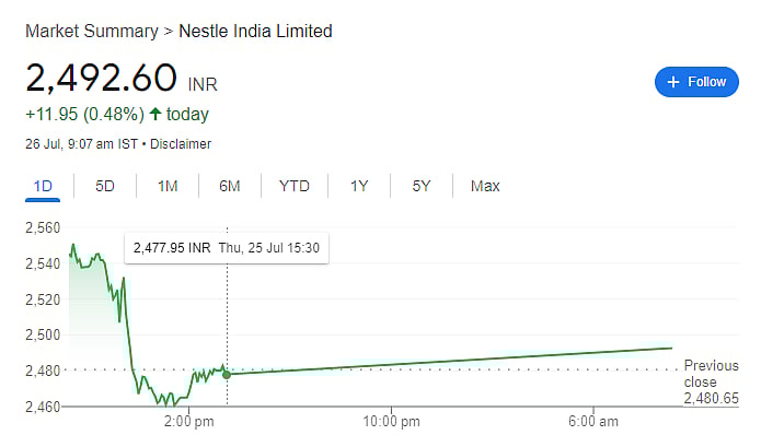 Operational revenue increased by 3.33 percent to Rs 4,813.95 crore from Rs 4,658.53 crore in the same quarter of the previous year. The quarterly results caused a decline in Nestle India's stock price. On the BSE, it was trading for Rs 2,504 apiece, down 1.56 per cent.