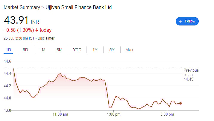 Ujjivan Small Finance Bank revealed that its Q1 net profit decreased by 7 per cent YoY to Rs 310 crore. While net interest income increased by 18.7 per cent YoY to Rs 941 crore, the bank's overall revenue for the quarter increased by 21 per cent YoY to Rs 1,774 crore. In response to the financial results, the bank's shares saw a 1.4 per cent decline, closing at Rs 43.88 per share.