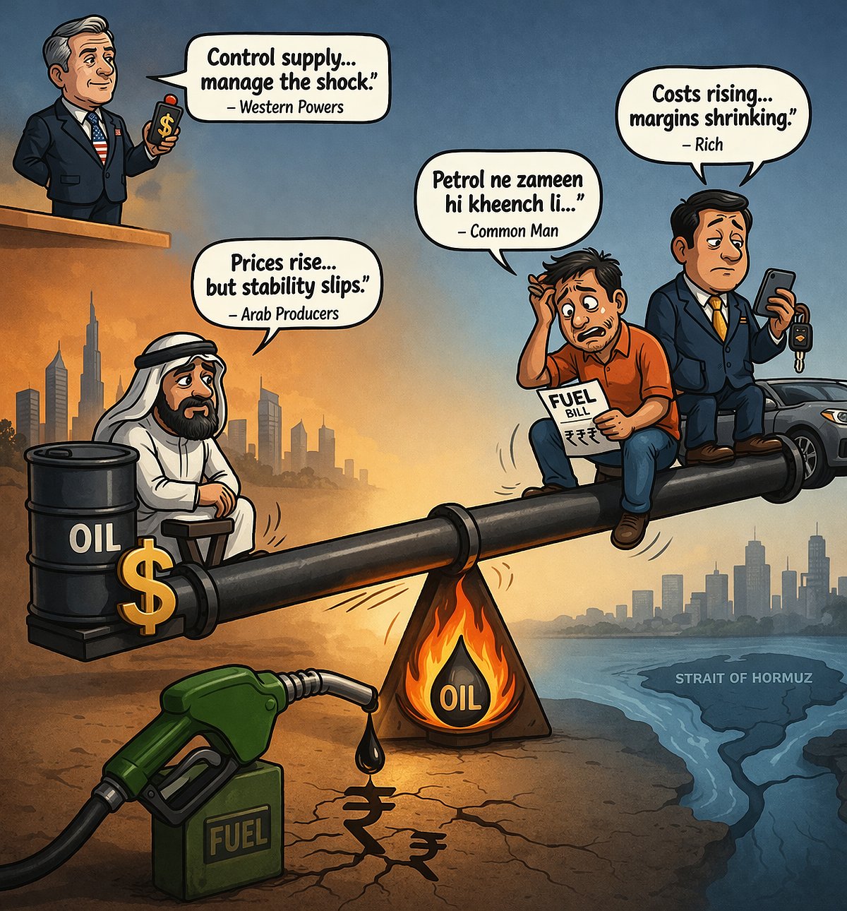 Today, the pattern sharpens. The 2026 Iran war, now past its fifth week, has choked the Strait of Hormuz—artery to nearly a fifth of global supply—pushing crude beyond $100 and towards a perilous $150–$190 range. Even as Iranian oil reaches India and select sea lanes hold, risks to shipping remain acute. Tehran’s central military command has rejected the US President’s 48-hour ultimatum, hardening the standoff. Oil is no longer merely priced—it is risked, and with every unresolved hour, markets add a fresh premium to the barrel.