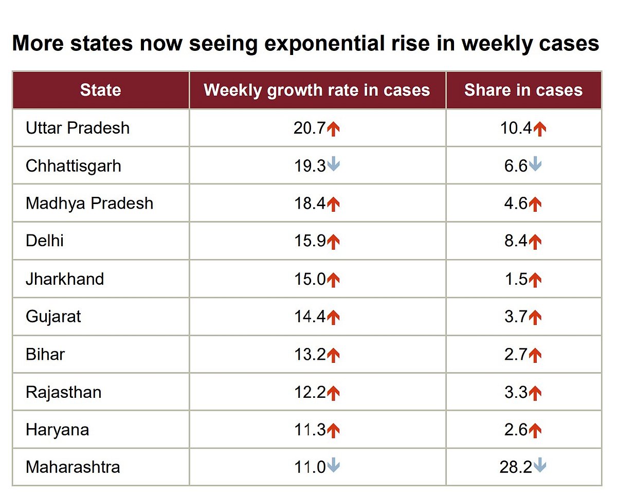 The report, which evaluated the present situation of the pandemic on the economy, stated among the states the rate of spread has not been secular. “Infection rates in Uttar Pradesh, Madhya Pradesh and Delhi significantly increased in the week ending April 18 (compared with the week prior) and, consequently, led to an increase in their share of caseload. In contrast, the rate of increase in cases in Chhattisgarh and Maharashtra slowed down, so their shares decreased (refer chart below),” it stated.