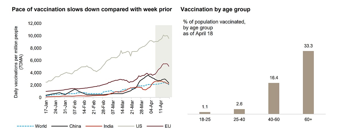 According to Crisil report, India’s average daily vaccination per million people in the week ending April 18 was 2408, lower than 2554 per million in the previous week, indicating the slowdown in pace. “As of April 18, 16.4 per cent of the population in the age group of 40-60 were vaccinated, and among those aged 60 plus, a higher 33.1 per cent have been vaccinated,” stated Crisil in its report.