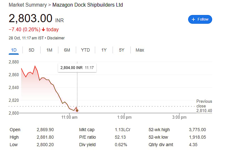 New Delhi: Shares of government-owned defense company Mazagon Dock Shipbuilders Ltd (MDL) witnessed strong momentum on Tuesday, rising by up to 2 percent to hit an intraday high of Rs 2,881. The rally came after the company reported a 28 percent year-on-year rise in net profit for the latest quarter, alongside higher revenue and a dividend announcement. Notably, the stock has gained 50 percent from its recent low levels.