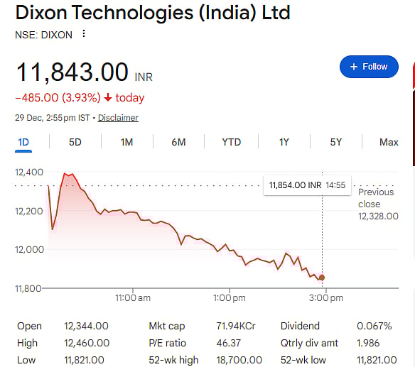 Mumbai: Shares of electronic manufacturing services company Dixon Technologies fell for the sixth straight session on Monday, December 29, dropping 4 percent to Rs 11,821, marking the lowest level since August 2024. The stock has been under heavy selling pressure since late September, losing 35 percent from Rs 18,471, driven largely by concerns over potential cuts to earnings per share estimates for FY27.