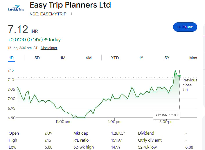 By 3:30 pm, EaseMyTrip shares were trading at Rs 7.12 on the NSE, up 0.14 percent from the previous close. The stock opened at Rs 7.09 and moved in a narrow range, hitting an intraday high of Rs 7.15, but remained well below its 52-week high of Rs 14.97.