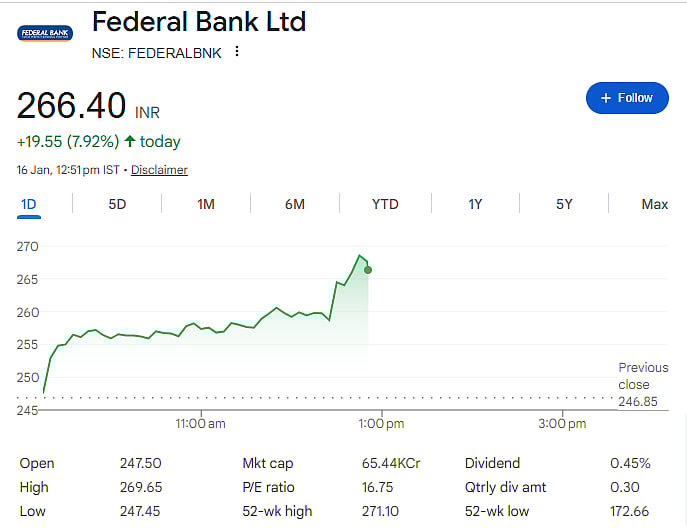 Following the results, Federal Bank shares traded at around ₹266, close to their recent highs. The stock has now recovered well from earlier lows and is moving closer to its 52-week high. Market participants believe the results show clear improvement in business strength and earnings visibility.