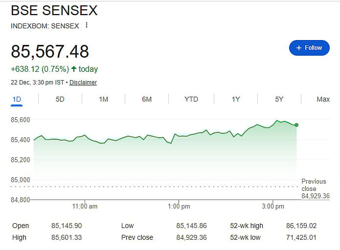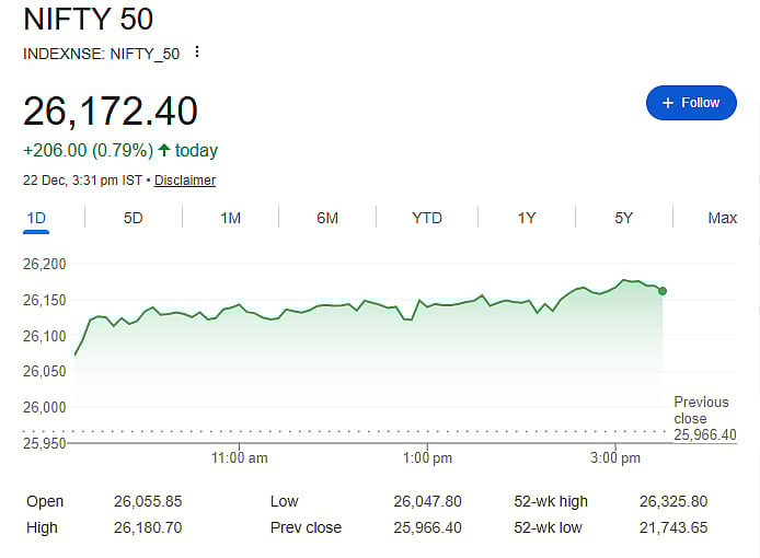 Mumbai: Indian stock markets witnessed a sharp rally, creating wealth of nearly Rs 3.5 lakh crore in a single session. The Sensex jumped 638 points to close at 85,567, while the Nifty rose 206 points to end at 26,172. The Nifty stayed above the 26,150 level throughout the day, showing strong buying support.
