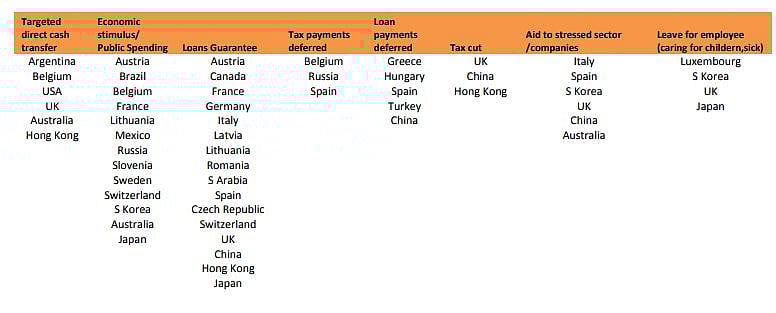 Governments have announced/ planning economic stimulus packages (beyond annual budget), providing loan guarantees, undertaking targeted direct cash payments, deferring tax and statutory payments, enabling debt negotiations, loan payments deferred, aid to stressed sectors, leave benefit for employee, tax cuts among others.