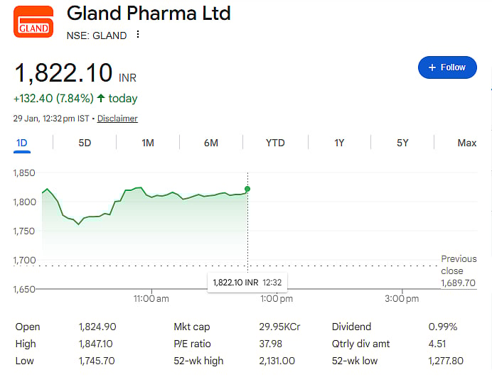 Mumbai: Shares of Gland Pharma surged sharply on Thursday, January 29, after the company reported strong earnings for the December quarter. On the NSE, the stock jumped as much as 9.32 percent to hit an intraday high of Rs 1,847.10. On the BSE, shares rose nearly 9.5 percent to touch Rs 1,849, driven by heavy buying interest.