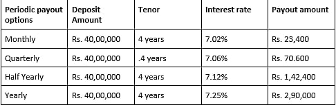If you want to earn a periodic interest from the same amount and tenor, then you can invest in non-cumulative FDs offered by Bajaj Finance FD. You will get the option of monthly, quarterly, six-monthly, and yearly interest payouts options and you can check the periodic interest amount from the table listed below:
