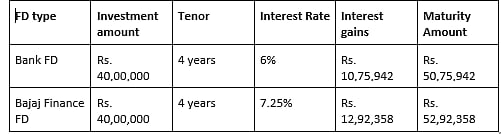 For instance, suppose you invest Rs. 40,00,000 in a bank FD then the applicable interest rate will be up to 6% that also only on choosing a longer tenor say 4 years. However, with the Bajaj Finance Fixed Deposit scheme, you get an interest rate of up to 7.25% for tenors ranging from 36 to 60 months. Now, if you invest the same amount for 4 years in this FD scheme, the returns will be much higher and this can be verified from the below table:
