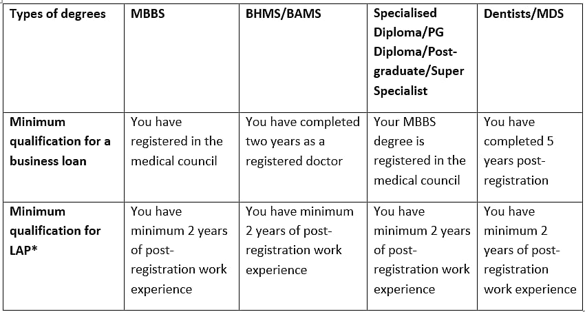Bajaj Finserv offers secured and collateral-free finance to doctors based on their degrees and qualifications. Since these eligibility terms are personalised for your profession, you can meet them with ease. You can opt for an unsecured business loan without pledging any assets and get up to Rs. 42 lakh. This can help you upgrade your clinic’s software and security, hire new staff, lease or buy medical equipment and more. With a loan against property, you can avail up to Rs. 2 crore. This can help you in the big-ticket transformations of your clinic. You can add new wings, buy or lease new space, add a pharmacy or lab to your clinic or more.