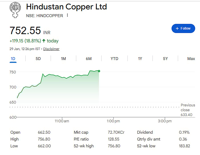 Mumbai: Shares of Hindustan Copper continued their sharp rally on Thursday, January 29, rising as much as 17.6 percent to hit a new 52-week high of Rs 745 on the NSE. Over the past six months, the stock has delivered a massive 188 percent return, making it one of the strongest performers in the metal space.