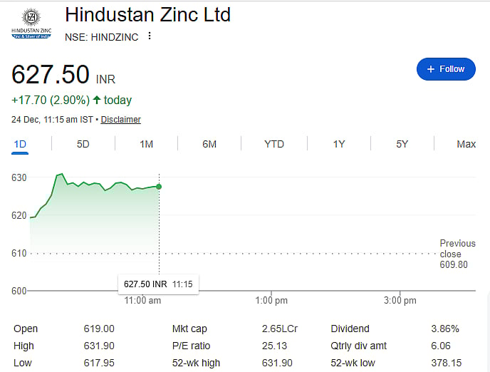 Mumbai: Hindustan Zinc Shares jumped sharply on Wednesday, December 24, as global silver prices touched a historic milestone. The stock rose 3.6 percent to an intraday high of Rs 632 on the BSE, reflecting strong investor interest following the rally in silver markets.