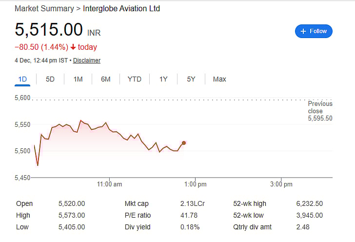 Mumbai: InterGlobe Aviation, the parent company of IndiGo, saw its share price fall nearly 3 percent on December 5, marking the second day of decline. The stock has dropped over 6 percent in just five sessions, mainly because IndiGo cancelled around 200 flights on Wednesday — one of the airline's biggest disruptions in years.