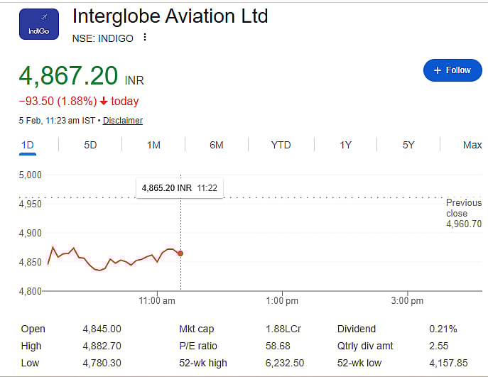 Mumbai: Shares of InterGlobe Aviation, the parent company of IndiGo, fell nearly 4 percent during Thursday morning trading after the Competition Commission of India (CCI) ordered a detailed investigation into alleged unfair business practices. The stock dropped 3.65 percent to Rs 4,782.45 on the BSE. On the NSE, the shares declined 3.63 percent to Rs 4,780.30 per share, reflecting investor concern over regulatory risks.