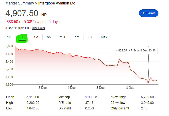 Mumbai: InterGlobe Aviation, the parent company of IndiGo, suffered a steep fall in market value on Monday as the airline continued to struggle with severe disruptions in flight operations. The stock plunged up to 10 percent to Rs 4,842-its sharpest single-day fall since February 2022—and marked its seventh straight session in the red.