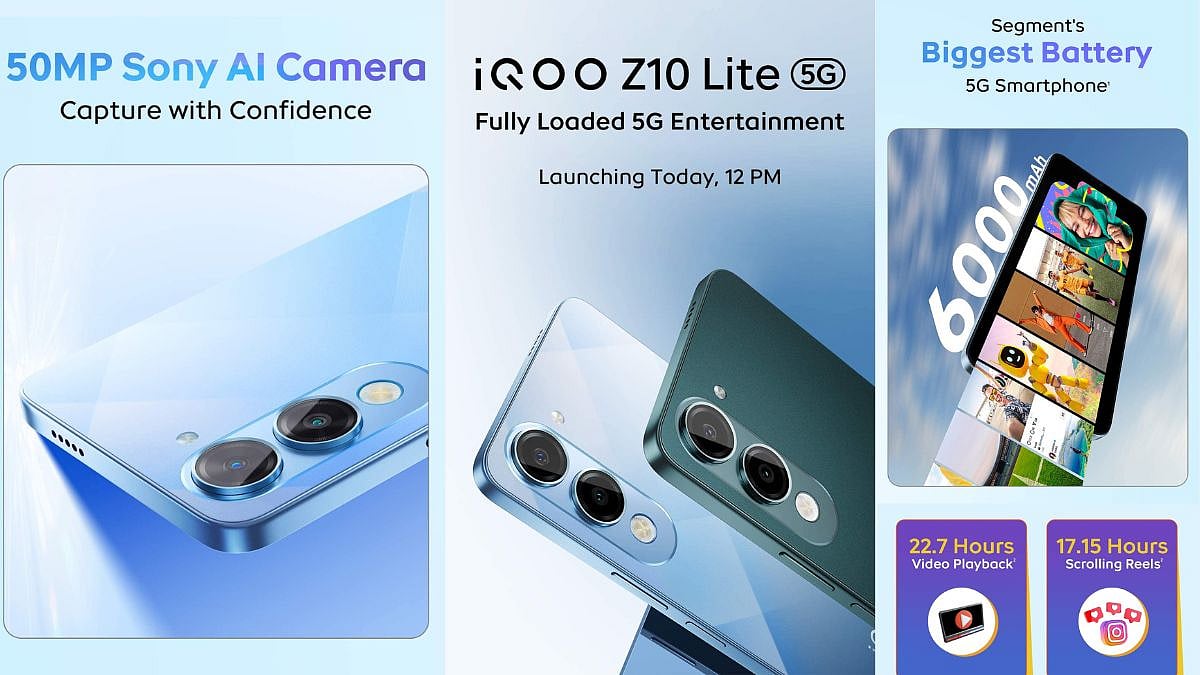The iQoo Z10 Lite 5G is launching today at 12 noon IST. The phone will be available exclusively on Amazon India and iQOO mShop. It is teased to come in two colour options – Cyber Green and Titanium Blue. There will be a dual camera setup at the back with a capsule-like module design and a flash sitting adjacent to the sensors. The phone is likely to have a side-mounted fingerprint sensor.
