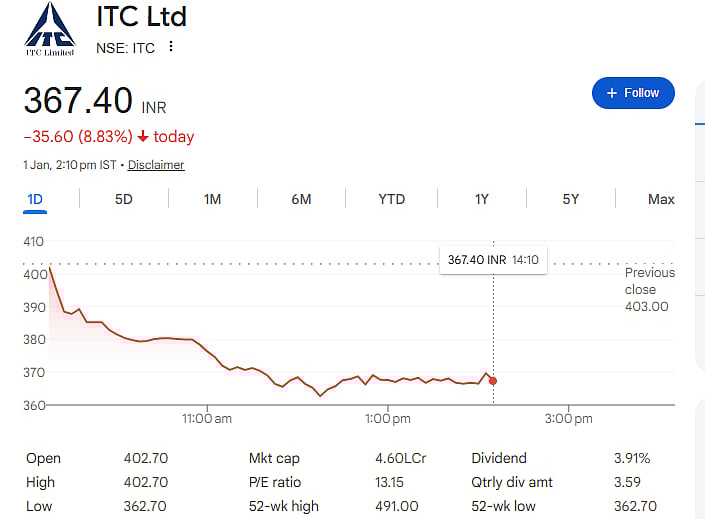 The sharp decline triggered a lower circuit, with ITC shares trading at Rs 365 per share at the time, limiting further losses for the day.