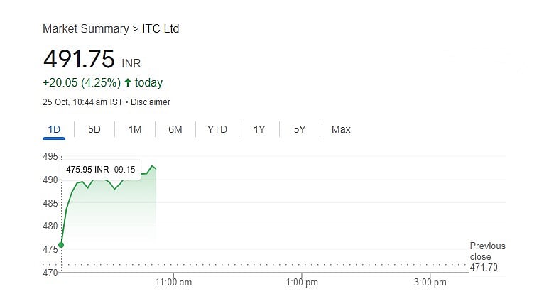 The shares of ITC surged to a day high level of Rs 493.50 after hitting the opening bell at Rs 475.80 per share on the Indian stock exchanges. The stock has recorded an all-time high level of Rs 528.50 per share on the Indian bourses.