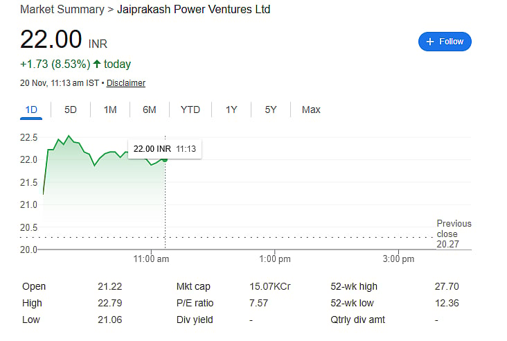 New Delhi: Jaiprakash Power Ventures Ltd. (JP Power) has been witnessing an exceptional rally this week. In just two trading sessions, the stock has jumped nearly 27 percent. On Thursday, the stock climbed another 10.5 percent to touch Rs 22.4, extending Wednesday’s sharp rise of 14.91 percent. This sudden and powerful surge is not a mere short-term reaction- its roots lie in a major corporate development involving the Adani Group.