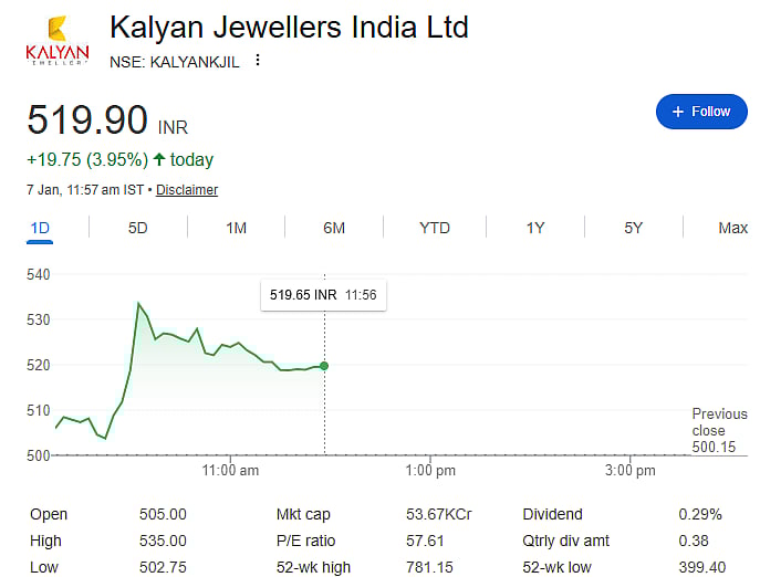 Mumbai: Shares of Kalyan Jewellers India Ltd rose nearly 6 percent on Wednesday, January 7, after the company announced a solid business update for the third quarter of FY26. Investors reacted positively to the strong growth numbers, driven mainly by festive buying and steady demand across markets.