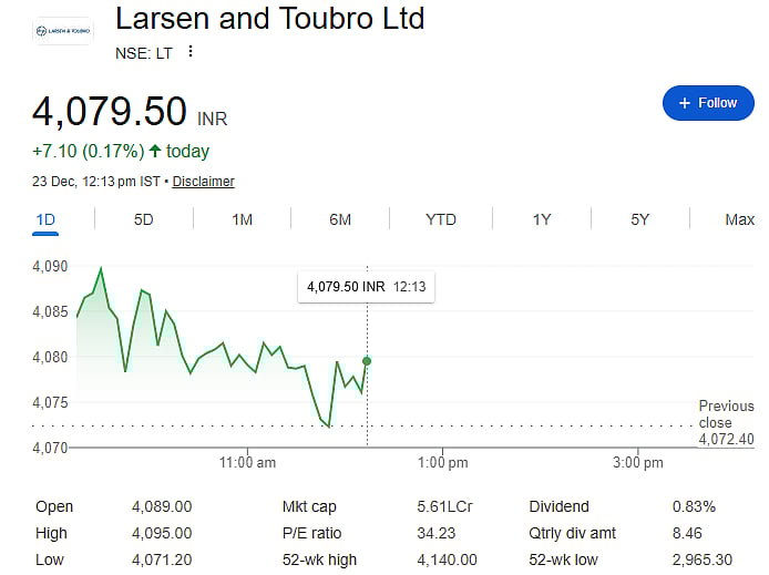 Following the announcement, L&T shares were trading around Rs 4,085, up nearly 0.3 per cent. The stock has gained about 11.5 percent so far in 2025, reflecting steady investor confidence.